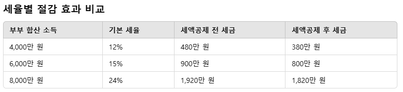 부부 합산 소득이 높을수록 절세 효과가 상대적으로 낮아질 수 있으니, 다른 공제 항목과 병행해 추가 혜택을 받을 수 있는 방법을 검토하세요.