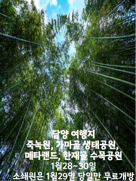 담양에 무려 4곳의 여행지에서 무료개방을 합니다. 기간은 25.01.28.~25.01.30.까지 이며,