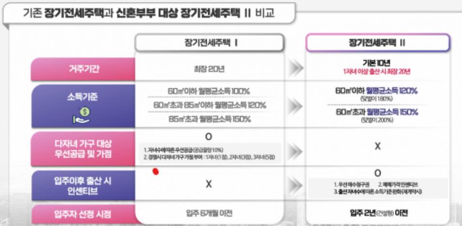 장기전세주택2는 신혼부부가 안정적으로 거주할 수 있도록 설계된 주택으로, 특히 출산을 계획 중인 가구를 지원하는 데 중점을 두고 있습니다. 이 주택은 장기적으로 저렴한 가격에 제공되며, 입주 후 출산 가구에게는 거주 기간 연장 등의 다양한 인센티브가 제공됩니다.