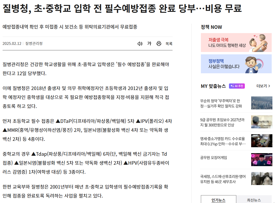 이처럼, 질병관리청은 초,중학교 입학 예정자에게 무료로 필수 예방접종을 지원하겠다고 하였습니다.