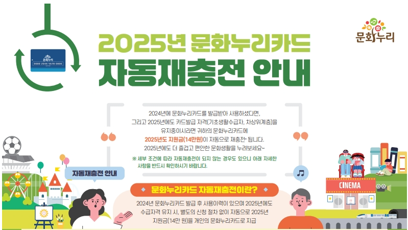2025년부터 문화누리카드에 자동 재충전 시스템이 도입되어, 카드 사용자가 별도로 신청하지 않아도 지원금이 자동으로 충전됩니다.