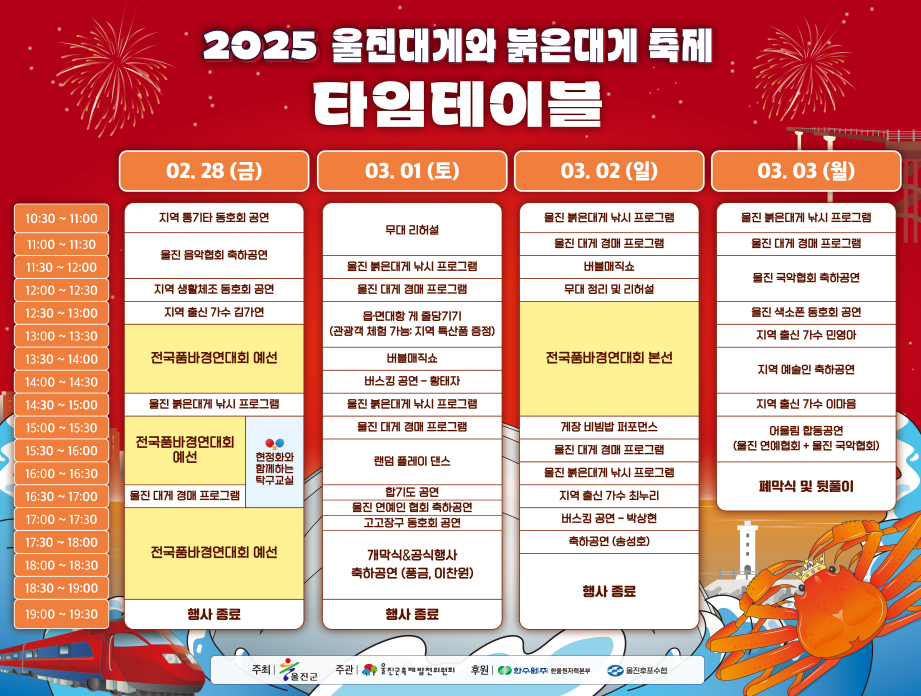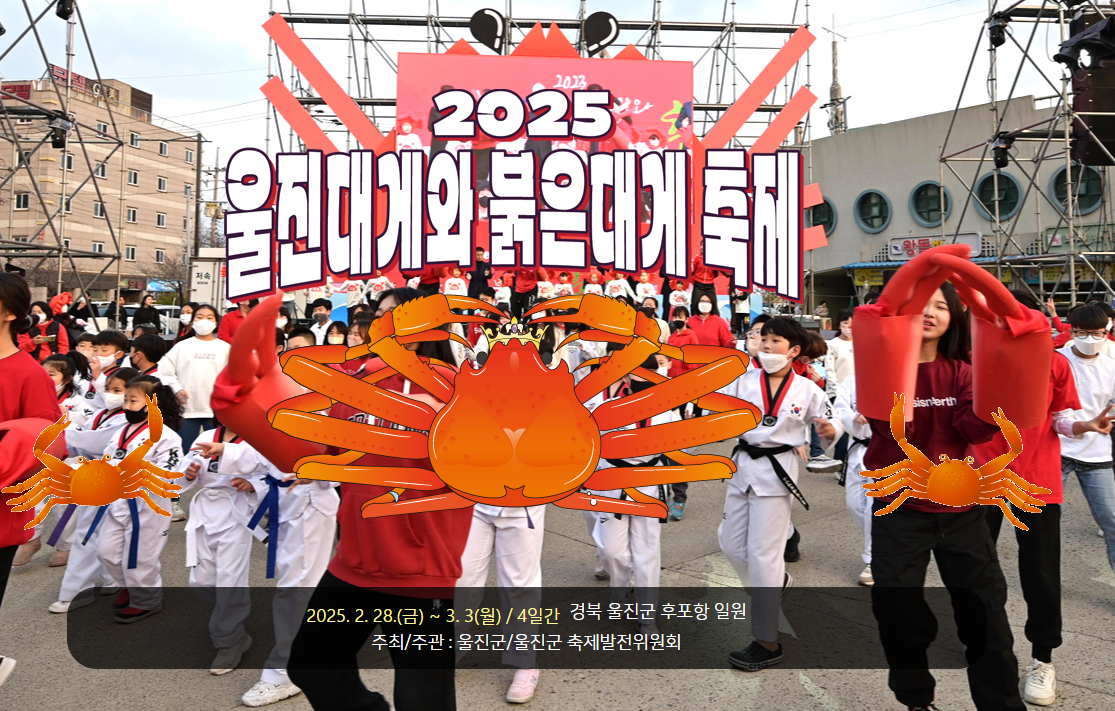 울진의 명물인 대게와 붉은대게를 즐길 수 있는 이 축제는 2025년 2월 28일부터 3월 3일까지 4일간 개최됩니다. 경북 울진군 후포면 후포항 일원에서 열리며, 울진군이 주최하고 울진군 축제발전위원회가 주관합니다.